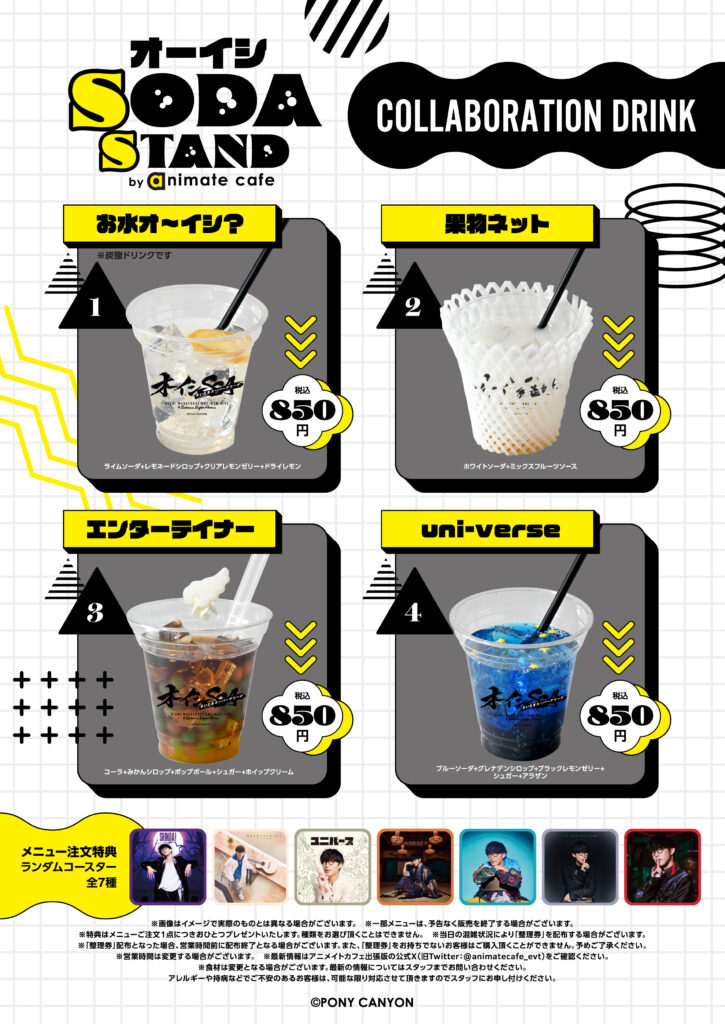 「オーイシ SODA STAND by animate cafe」ご利用方法:フリー入場(混雑時、整理券配布の場合あり)※掲載内容は予告なく変更する場合がございます、予めご了承ください。